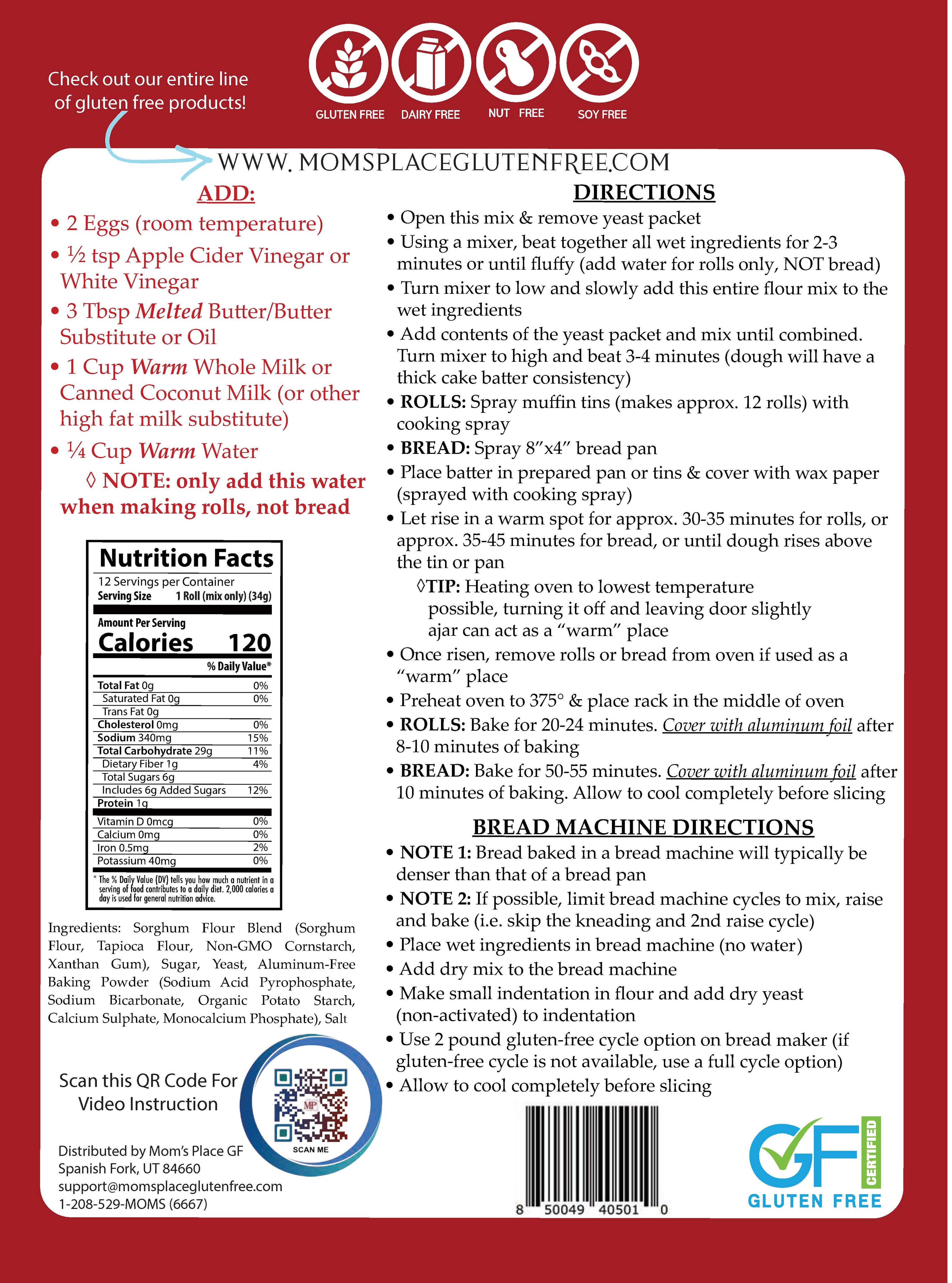 Mom’s Place Gluten-Free “I Can’t Believe These Aren’t Wheat” Rolls or Bread Mix delivers the taste and texture of traditional wheat bread—without the gluten. Made with a carefully crafted blend...